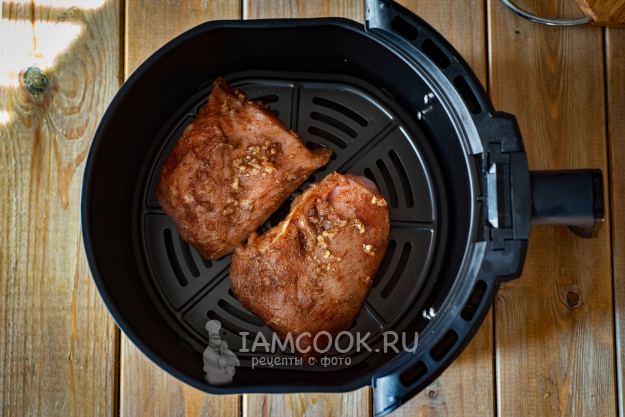 Затем замаринованные стейки индейки выложим на решетку чаши аэрогриля, установим температуру в 200 градусов и время в 25 минут. Примерно на 15-й минуте сделаем одно переворачивание стейков.