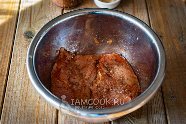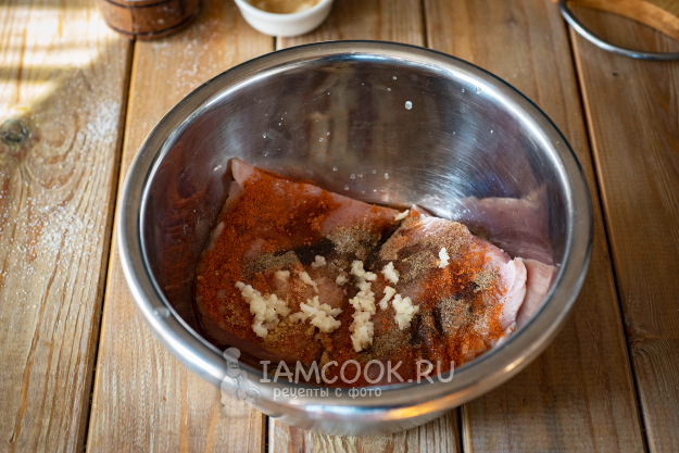 Эти два стейка индейки выложим в миску, добавим соль, перец черный молотый, паприку, молотый имбирь.
