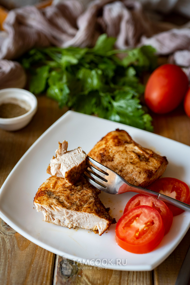 Запеченные в аэрогриле стейки индейки подаем к столу горячими. Приятного аппетита!