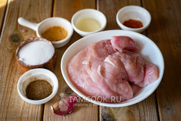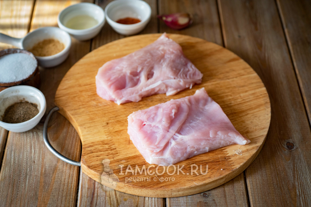 Ингредиенты для приготовления стейка из индейки в аэрогриле соберём по списку. Филе индейки ополоснем в проточной воде, чеснок почистим.