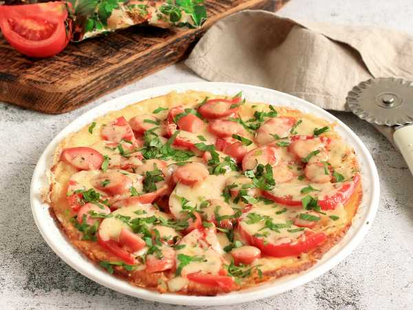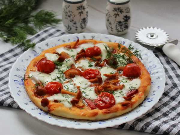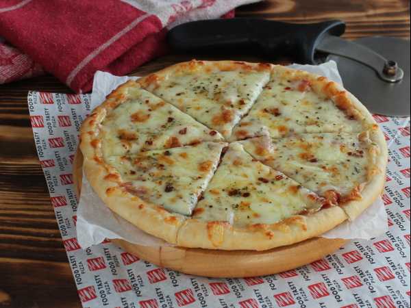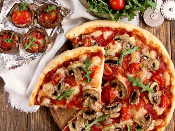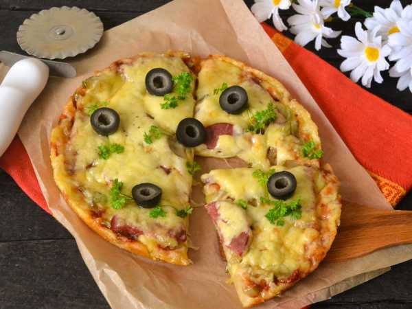 Нарезать пиццу на порционные кусочки и можно подавать на стол.
