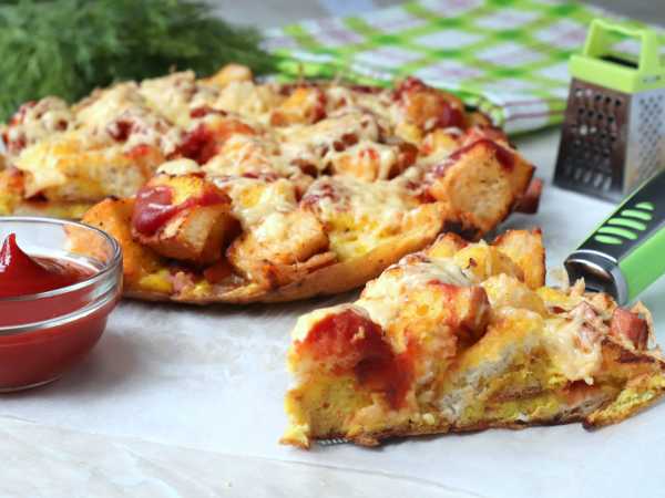Поджарить батон до румяной корочки, заполнив им всё дно. Толщина ломтиков батона - 1-1.5 см, подойдёт и магазинная нарезка.