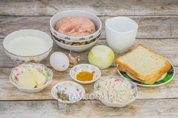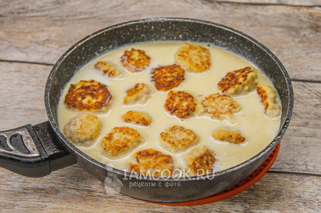 Соберите ингредиенты для приготовления фрикаделек в сливочном соусе в сковороде.