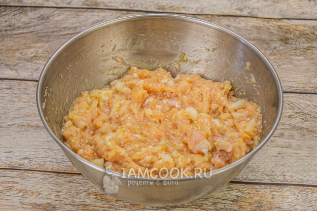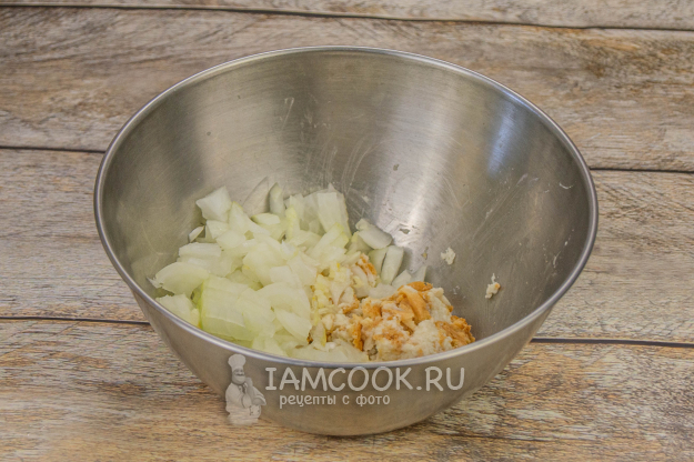 Хлеб замочить в воде или молоке. Затем отжать. Хлеб пробить блендером и смешать с луком.