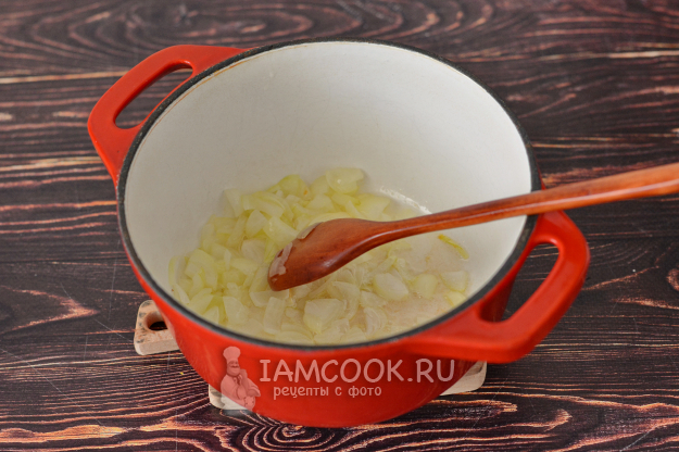 Разогрейте сливочное масло и поджарьте на нём до лёгкого золотистого цвета нарезанный лук.