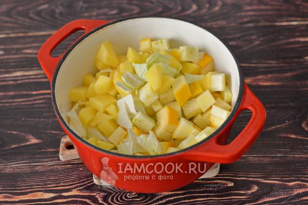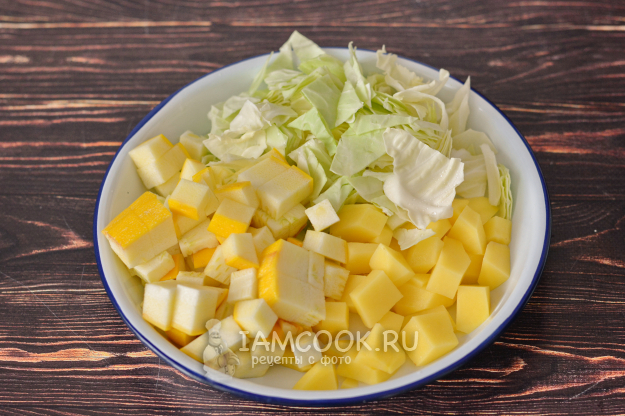 Картофель, кабачок и капусту нарежьте произвольно. Нарезка не важна, ведь суп будет измельчаться. Но чем мельче нарезка, тем быстрее готовка!