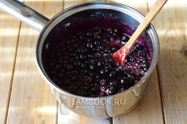Поставим на небольшой (ближе к среднему) огонь и будем, помешивая ложкой, ждать, когда растворится весь сахар и ягодный сироп начнет закипать. При активном кипении сиропа будем варить варенье 5 минут, затем кастрюльку снимем с плиты.