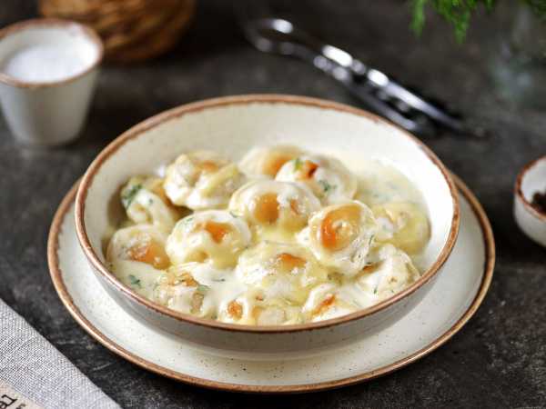 Получившимся сметанным соусом залейте пельмени в чаше. Перемешайте, чтобы соус равномерно покрыл каждую пельмешку.