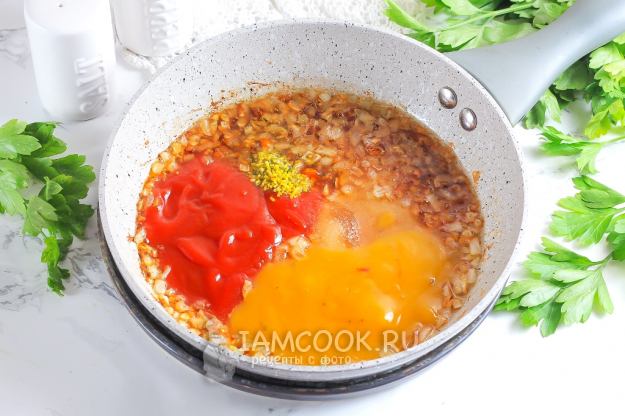 К обжаренному луку добавьте все соусы, приправу, соль и сахар, влейте горячую воду. Аккуратно все перемешайте.