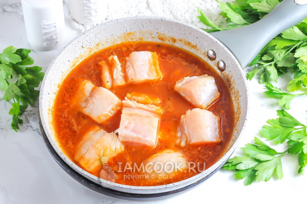 Выложите в соус ломтики рыбы и потушите 5 минут на среднем нагреве. Если ломтики крупные, то тушите 7-8 минут.