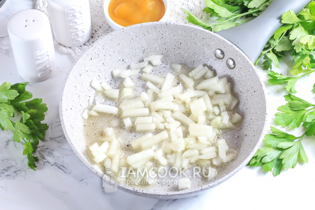 Репчатый лук очистите от кожуры и промойте в воде. Нарежьте мелкими кубиками или полукольцами. Прогрейте на сковороде растительное масло и обжарьте лук в течение 3-4 минут до румяности. В это время ножом очистите кожицу минтая. Он продается в уже очищенном виде, но на кожице зачастую остается небольшое количество чешуи. Промойте рыбу и нарежьте порционными кусочками.