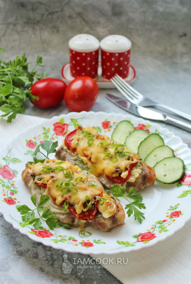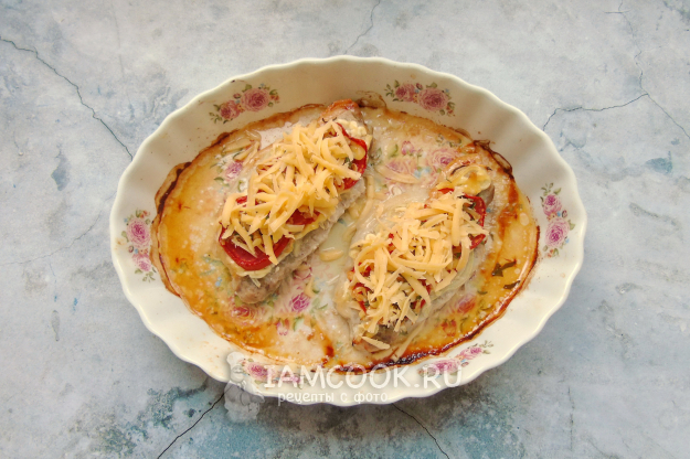 Запекайте стейки из свинины с помидором в духовке, разогретой до 185-190 градусов, 35-40 минут. После достаньте из духовки и посыпьте тертым сыром.
