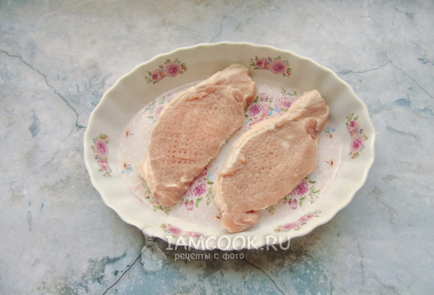 Стейки отбейте с обеих сторон, посолите и поперчите. Выложите в форму для запекания.