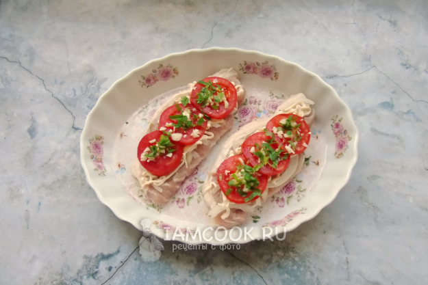 Помидоры нарежьте кружками, чеснок и петрушку мелко нарежьте. Выложите на стейки свинины.