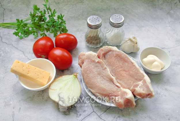 Соберите ингредиенты для приготовления стейка из свинины с помидорами в духовке. Подойдет карбонад или шейная часть.