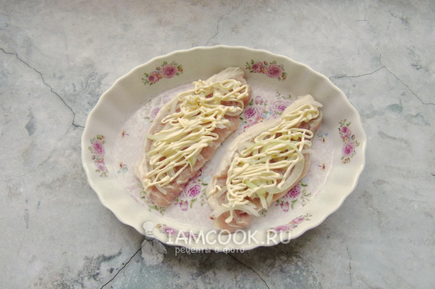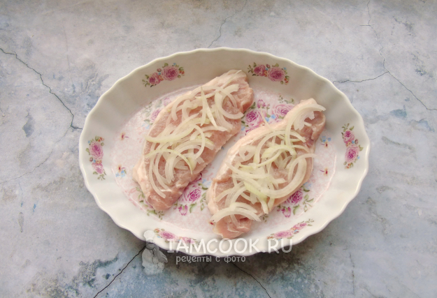 Лук очистите, помойте и нарежьте полукольцами. Выложите на мясо.