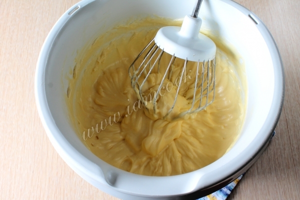 Взбить размягчённое масло добела, постепенно добавляя заварную смесь.