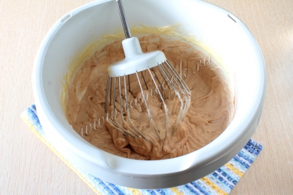 Всыпать муку, просеянную с какао. Обязательно просеивайте и муку и какао, чтобы обогатить их кислородом и избавить от ненужных примесей. Перемешать очень осторожно от края к середине. Влить по краю сливочное масло, растопленное и остуженное до t 30ºC.