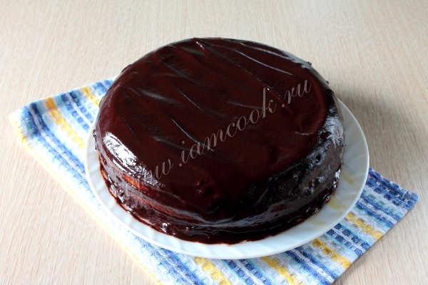 Верх торта полить растопленным шоколадом (растопите поломанные кусочки шоколада (содержание какао 70%) с добавлением масла на водяной бане или в микроволновке). Убрать торт на несколько часов в холодильник.