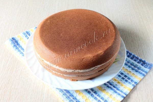 Разрезать бисквит на 3 коржа. Прослоить коржи кремом.