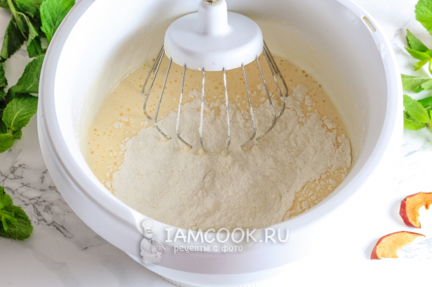 Выложите сметану и влейте растительное масло. Аккуратно перемешайте. Всыпьте пшеничную муку и разрыхлитель, вмешайте их в тесто силиконовой лопаткой, но не взбивайте!