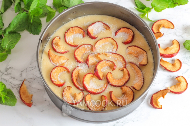 Смажьте форму растительным маслом и выложите в нее приготовленное тесто. Выложите сушеные яблоки, а еще лучше - вдавите их в тесто. Присыпьте сахарным песком - это по желанию.