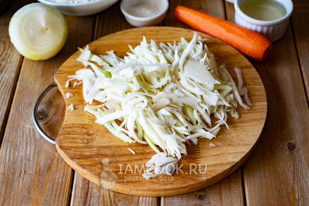 Готовим начинку. Нашинкуем капусту тонкой соломкой.
