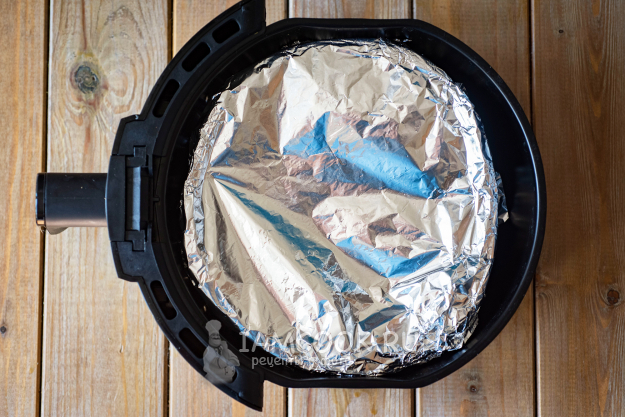 Форму с заготовкой пирога укроем листом фольги и поместим в чашу аэрогриля. Установим температуру в 180 градусов и время 25 минут, затем фольгу с формы снимем и продолжим выпекать заливной пирог с капустой в аэрогриле при температуре 180 градусов еще 20 минут.