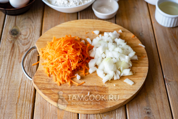 Морковь натрем на крупной терке, лук мелко нашинкуем.