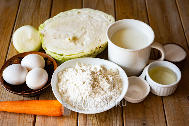 Ингредиенты для приготовления заливного пирога с капустой в аэрогриле - перед вами. Лук и морковь почистим и помоем. Капусту ополоснем.