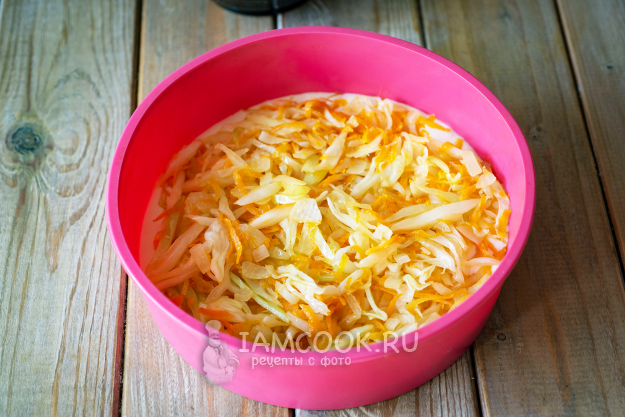 В работе у меня силиконовая форма и я ее ничем не смазываю. На дно формы зальем половину теста, поверх разложим слоем капустную начинку.
