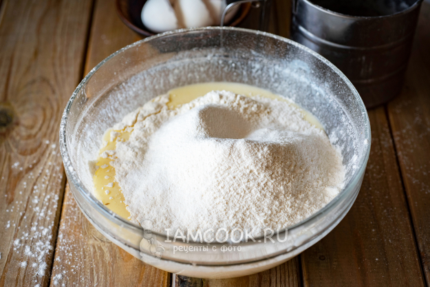 К жидкой смеси просеем муку, добавим соду и соль.
