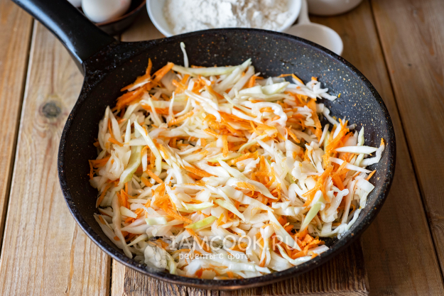 На сковороде разогреем растительное масло и выложим капусту, морковь и лук. Посолим. Будем на среднем огне обжаривать овощи, постоянно помешивая лопаткой, 10-12 минут.