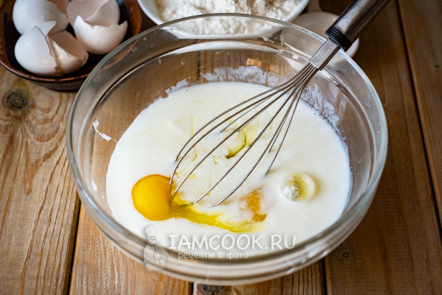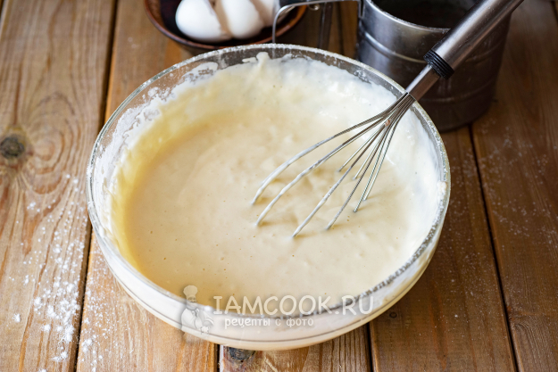 Венчиком перемешаем эти ингредиенты до получения достаточно жидкого, однородного теста.