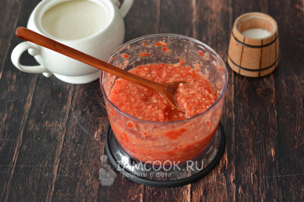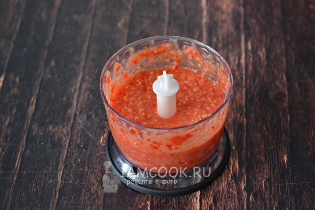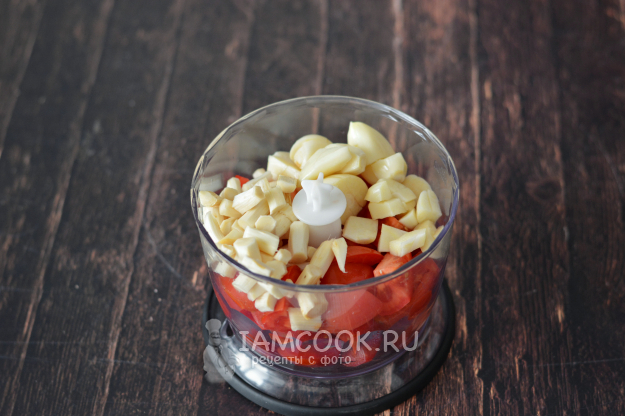Готовить хреновину можно при помощи мясорубки или при помощи блендера. Я использую обычный блендер. Сложите в чашу блендера помидоры, хрен и чеснок. Чтобы технике было легче измельчить всё, нарежьте овощи произвольно на кусочки.