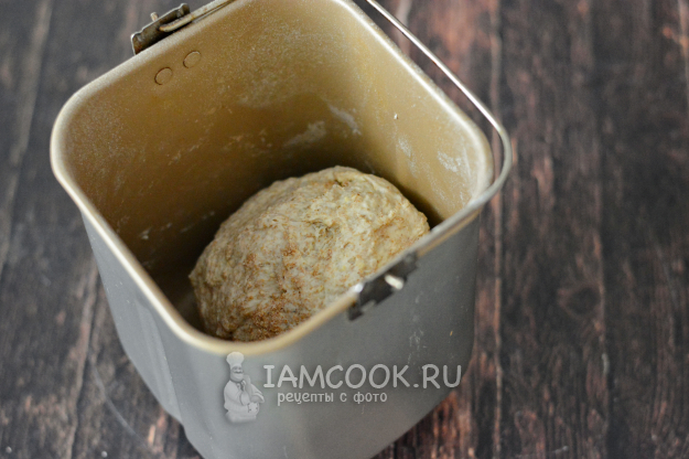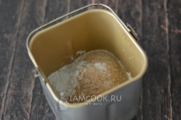 Для замеса в хлебопечке влейте в ведёрко хлебопечки растворённые в воде дрожжи, вбейте яйцо, добавьте масло. Сверху на жидкие ингредиенты насыпьте муку и отруби, добавьте соль и сахар.