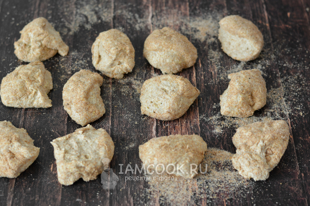 Подпылите поверхность отрубями и разделите тесто на небольшие кусочки.