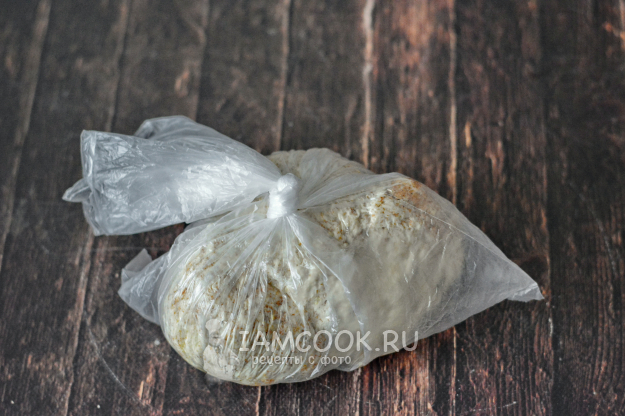 Готовое тесто поместите в полиэтиленовый пакет, выпустите воздух и завяжите его. Отправьте пакет с дрожжевым тестом в холодильник на 8-12 часов (то есть на ночь).