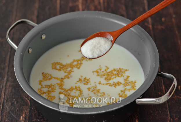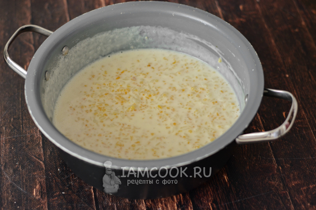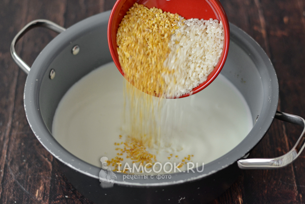 В кастрюле с толстым дном доведите до кипения молоко. В кипящее молоко всыпьте оба вида крупы.