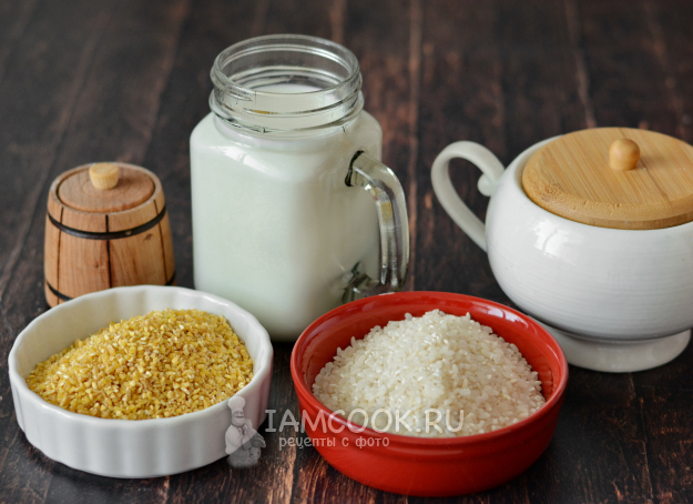 Соберите продукты для приготовления рисово-пшеничной каши на молоке.