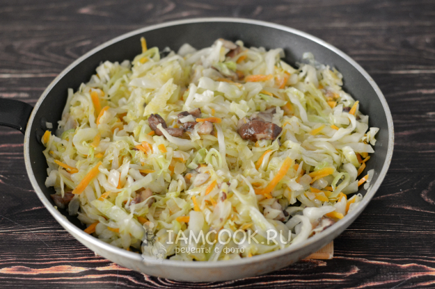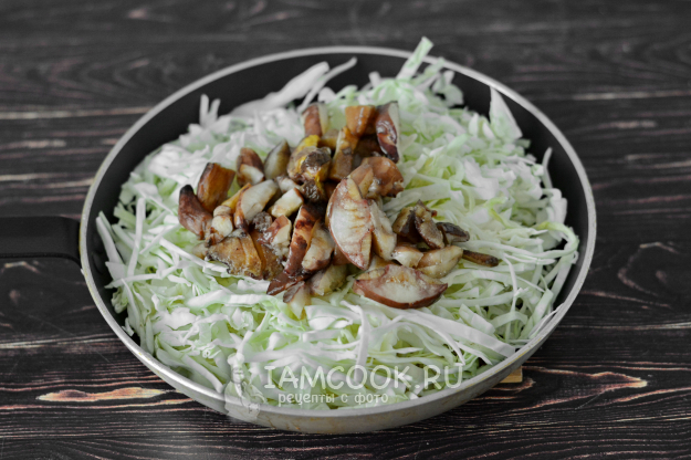 Добавьте капусту и маслята, обжаривайте на сильном огне, пока капуста не осядет.