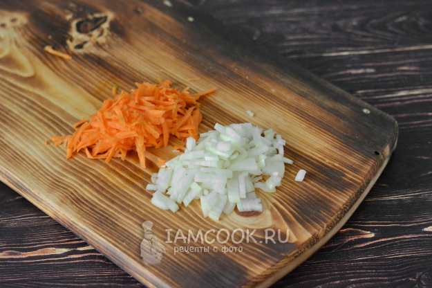 Нарежьте мелко лук и натрите на крупной тёрке морковь.