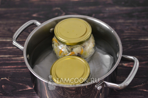 Я считаю, что для заготовок с грибами стерилизация обязательна в целях безопасности. Поэтому на дно кастрюли постелите чистую тряпочку, установите в кастрюлю банки, прикрытые крышками. Влейте в кастрюлю холодную воду по "плечики" банок и поставьте на плиту.