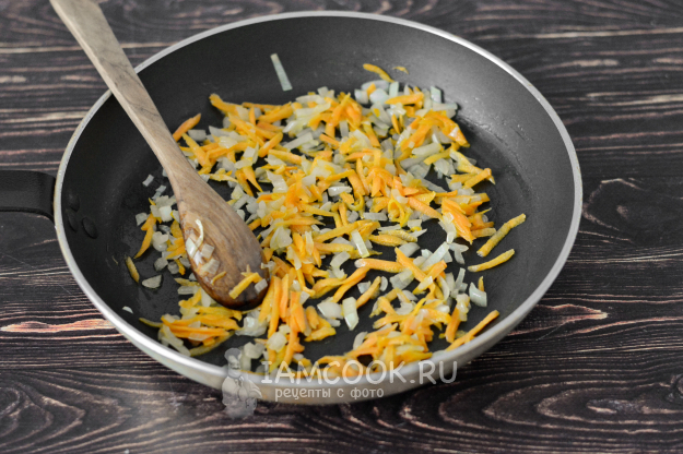 Разогрейте в сковороде растительное масло и обжарьте на среднем огне лук с морковью до золотистого цвета.