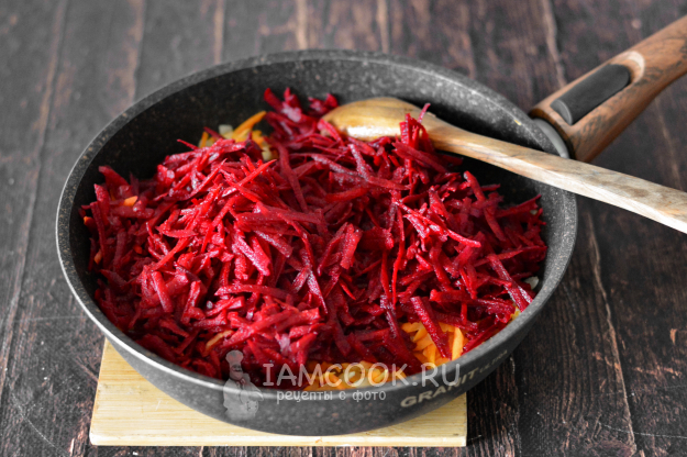 Свеклу натрите на крупной тёрке, добавьте в сковороду с луком и морковью. Обжарьте свеклу вместе с ними около 5 минут.