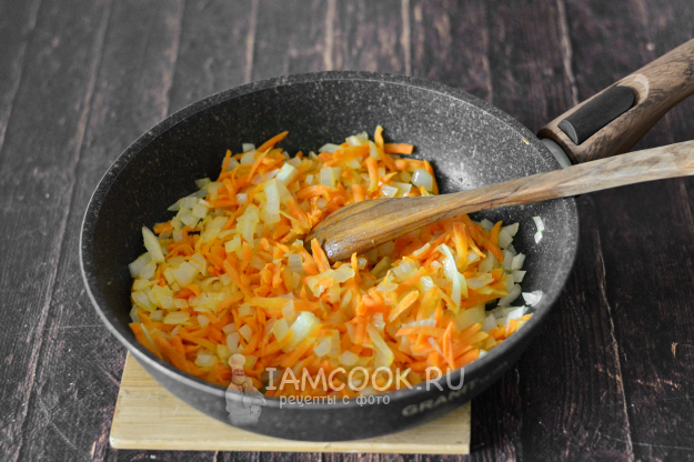 В глубокой сковороде разогрейте масло. Нарежьте мелко лук, натрите на крупной тёрке морковь и обжарьте овощи до золотистого цвета на сильном огне.