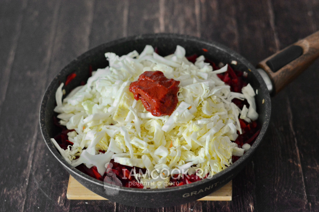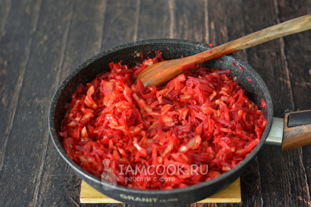 Сковороду накройте крышкой, убавьте огонь и тушите заправку для борща с капустой 30 минут. Периодически помешивайте содержимое сковороды.