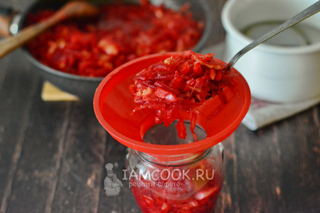 Разложите готовую кипящую борщевую заправку в горячие банки и тут же закрутите горячими крышками. Удобно это делать по одной банке: сняли с кипящего чайника, сложили в банку заправку, вилкой подцепили крышку из кипятка и закрутили. А тем временем на чайнике уже стерилизуется следующая банка.