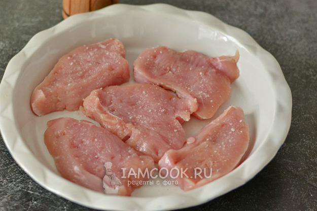 В форму для запекания выложите стейки грудки индейки и посолите их по вкусу.