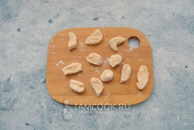 Часть теста отрежьте, раскатайте в колбаску и нарежьте её на кусочки. В зависимости от толщины колбаски кусочки могут быть больше или меньше, решать вам.